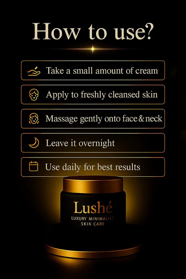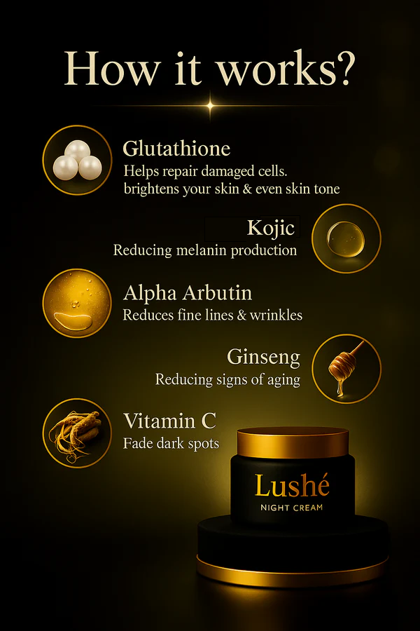 Experience brightened ,radiant, even-toned, glass-like skin in just 5 days with 🌙 Lushé Korean Night Glow Cream — a dermatologist-tested, K-beauty formula powered by premium Korean ingredients that brightens overnight, fades dark spots & pigmentation, smooths wrinkles, tightens skin, exfoliates gently, strengthens your skin barrier, and delivers guaranteed results or your money back.